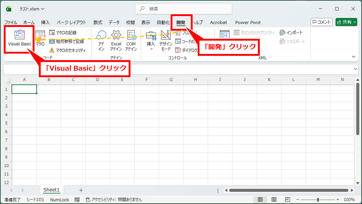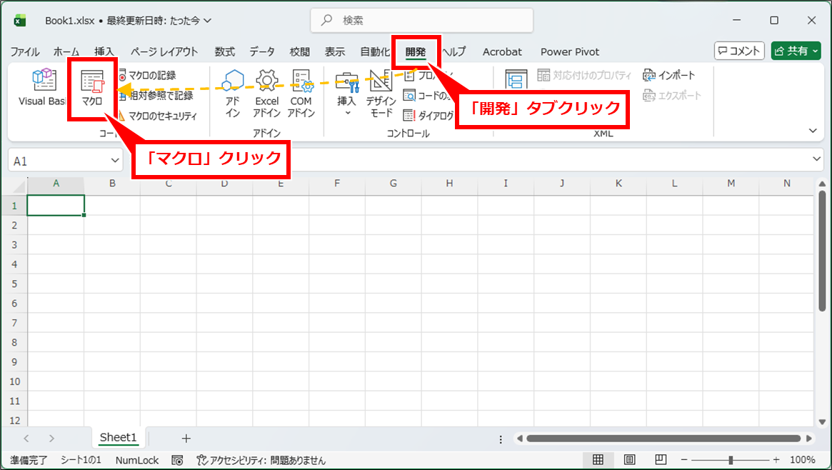👉 これで Excel 画面に [開発]タブ が表示される。