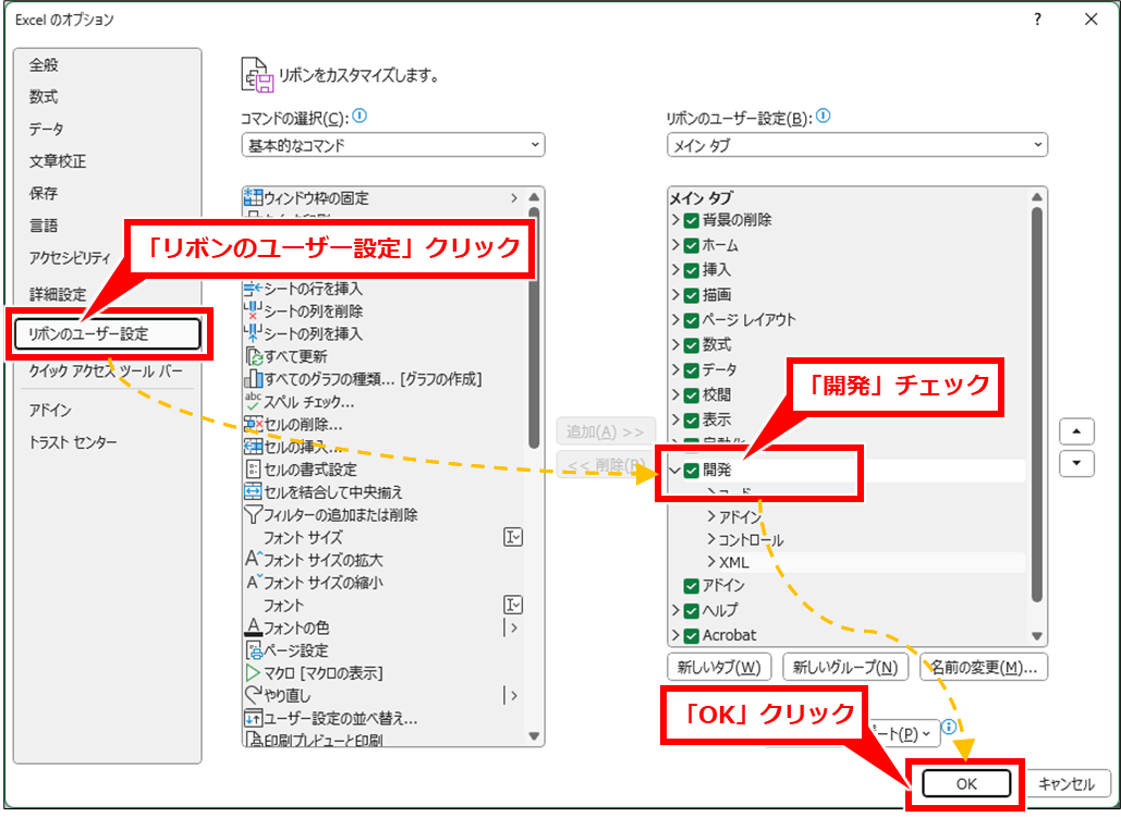 左メニュー [リボンのユーザー設定]クリックし、右側の一覧で [開発] にチェックし、[OK]クリック](https://itmemo123.net/wp-content/uploads/2025/12/image-2.png)