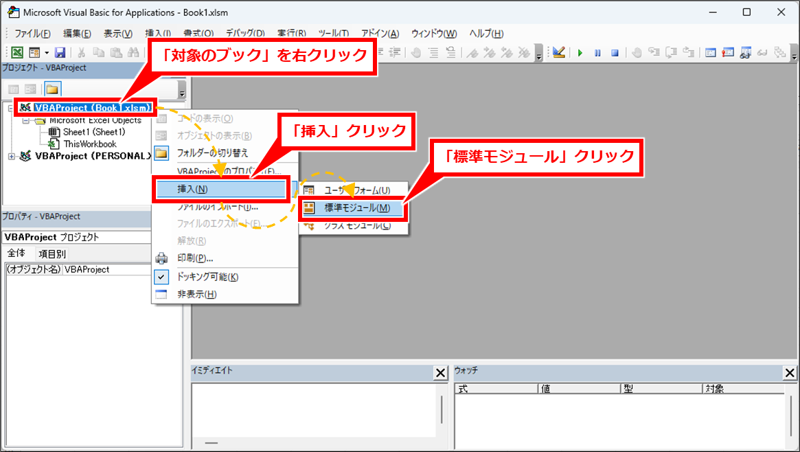 対象のブックを右クリックし、[挿入]→[標準モジュール]を順にクリック