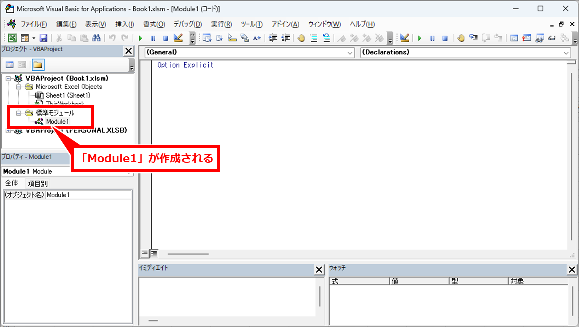 追加された Module1 をクリックし、右側のコードウィンドウに記述する。