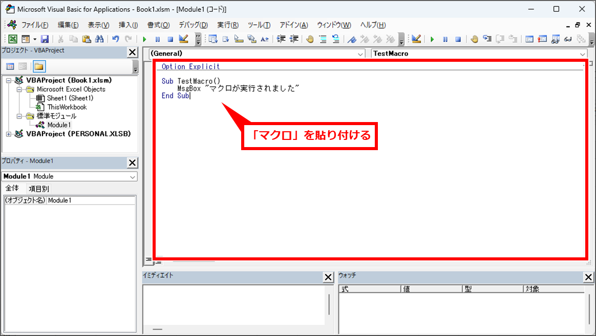マクロを右側のコードウインドウに貼り付ける(記述する)