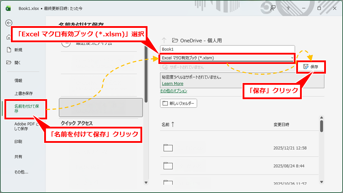 [名前を付けて保存]クリックし、[Excel マクロ有効ブック (*.xlsm)]を選択し、[保存]クリック](https://itmemo123.net/wp-content/uploads/2025/12/image-8.png)